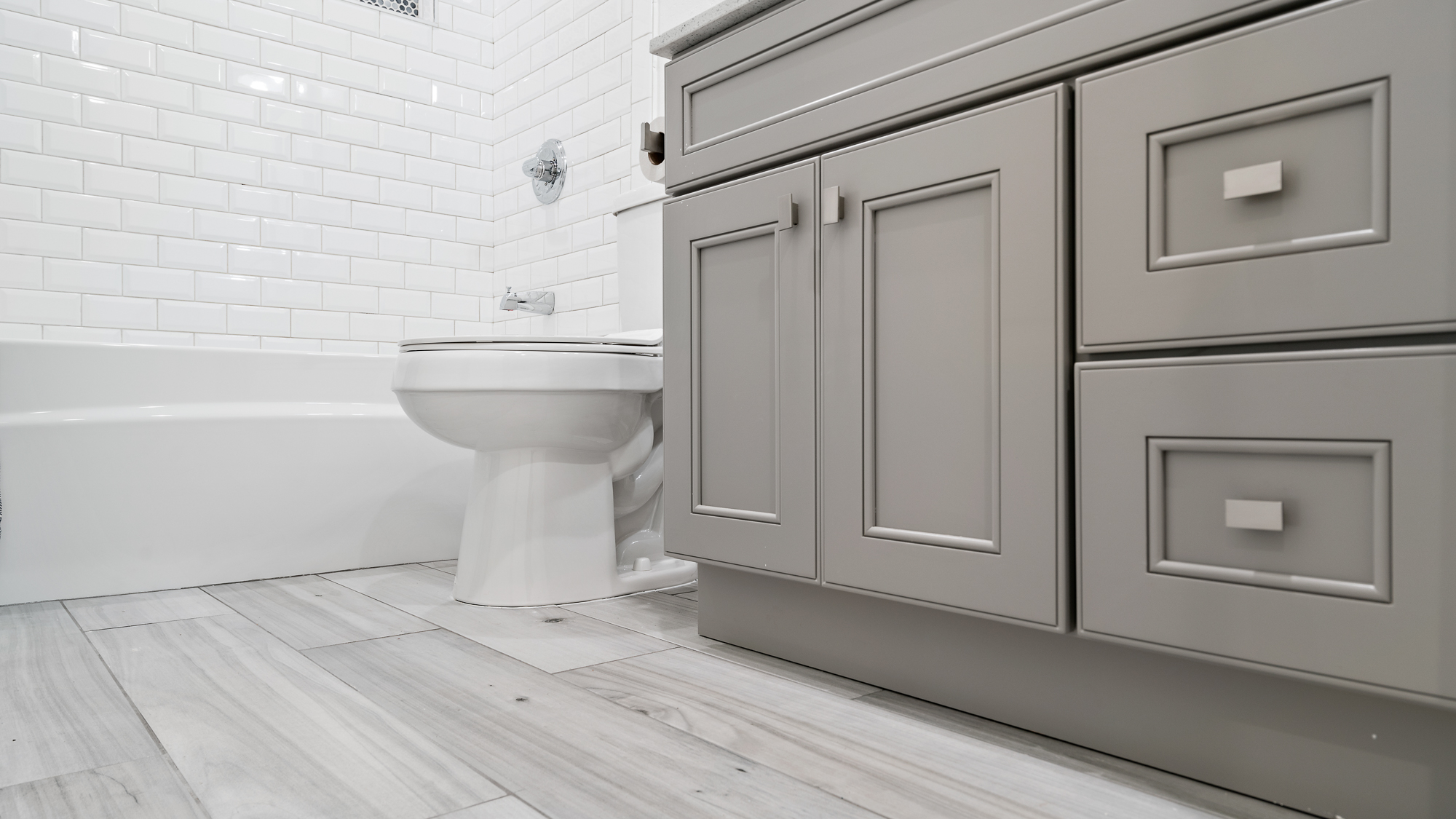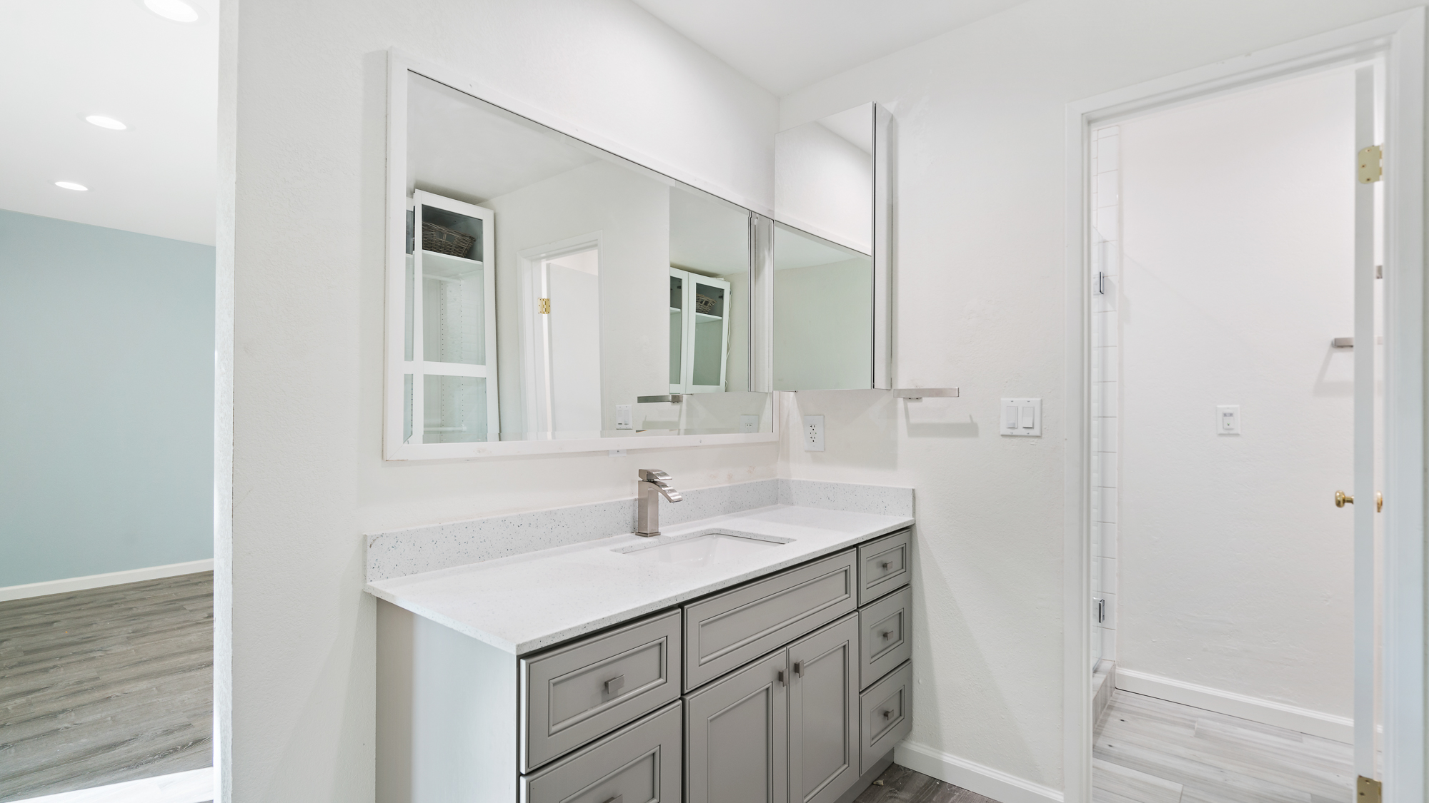 This is a modern updated bathroom. The shower has beautiful white tiled walls and an attractive and efficient linear drain. Sleek white countertops contribute a clean fresh look. Multiple shower niches afford plenty of shelf space. The state-of-the-art water efficient shower head provides for a comfortable shower experience. Bluish gray flooring coordinates beautifully with the modern cabinets. The silver cabinet handles complement the modern sink and shower fixtures and complete the new look of the bathroom. The recessed lighting helped create just the right atmosphere for this new space.