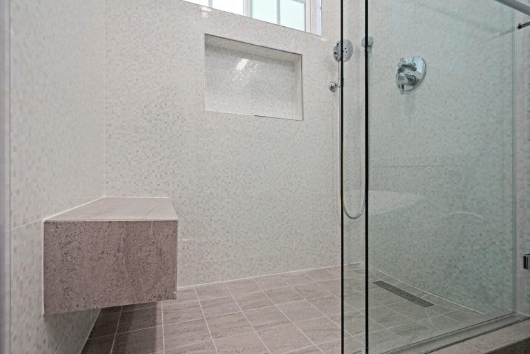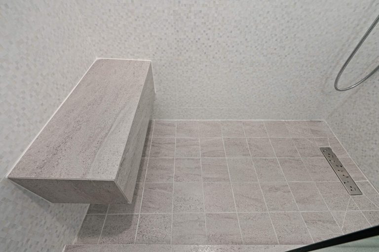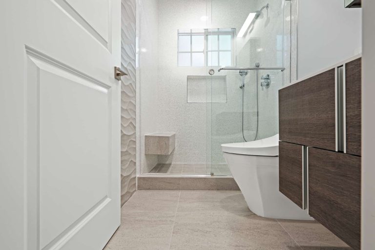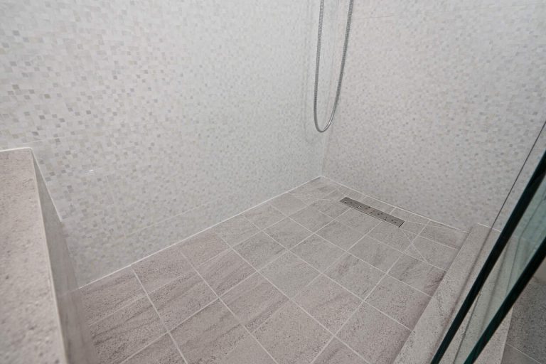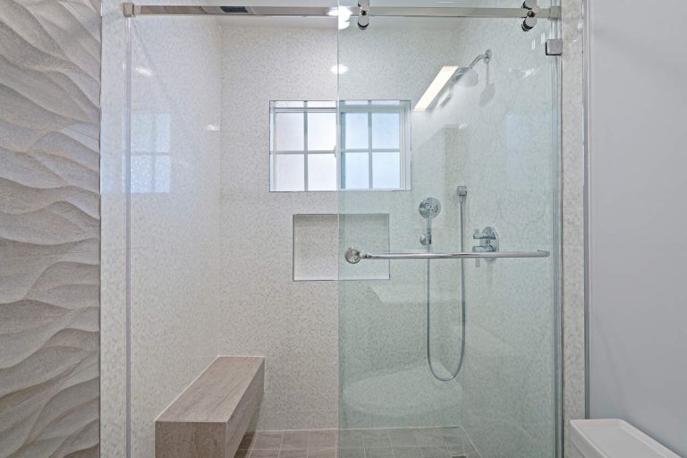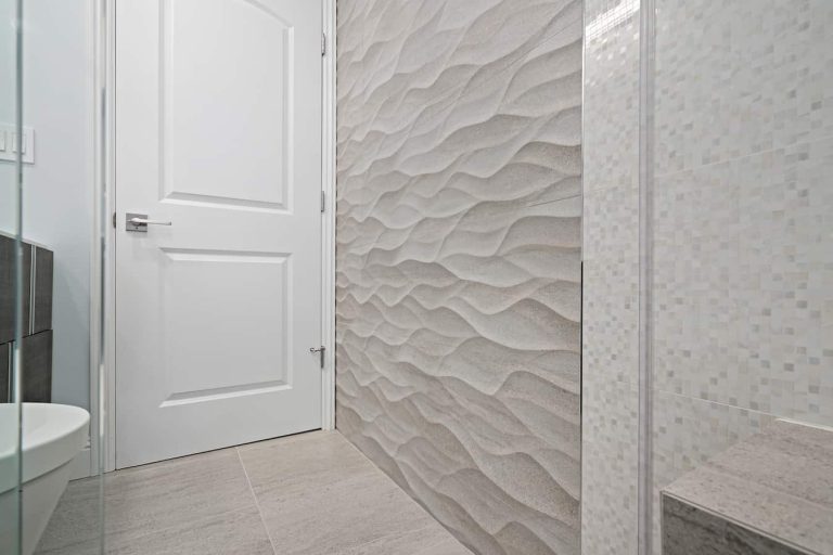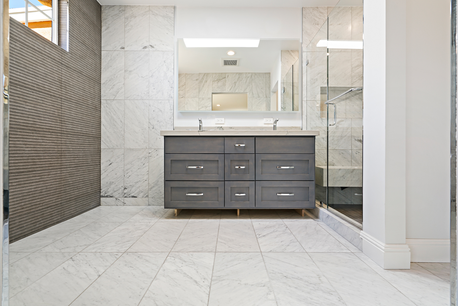 The detail of this bathroom is really what makes the space unique! The multi-shaded tile design on the shower wall along with the simple tile on the shower floor allows the space to have multiple designs while avoiding too much of a busy look. We then added to the uniqueness by having a textured wall and installed brand new vanity cabinets that stand out right when you walk in!