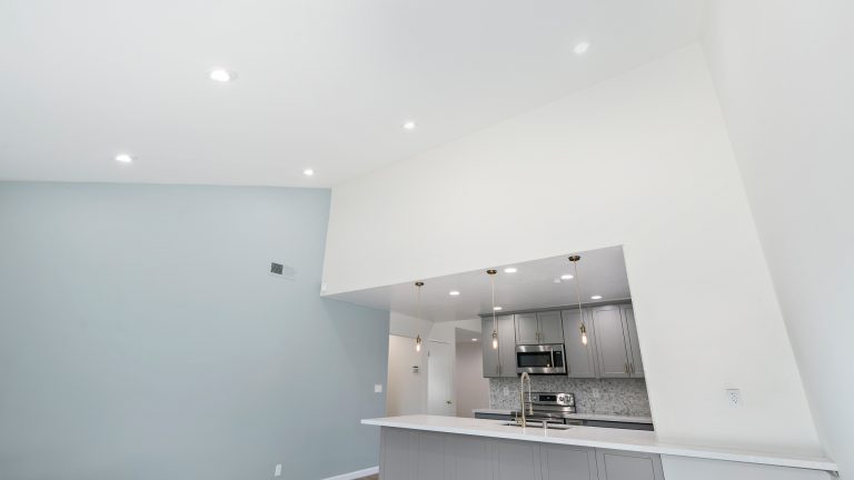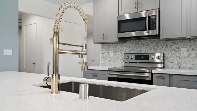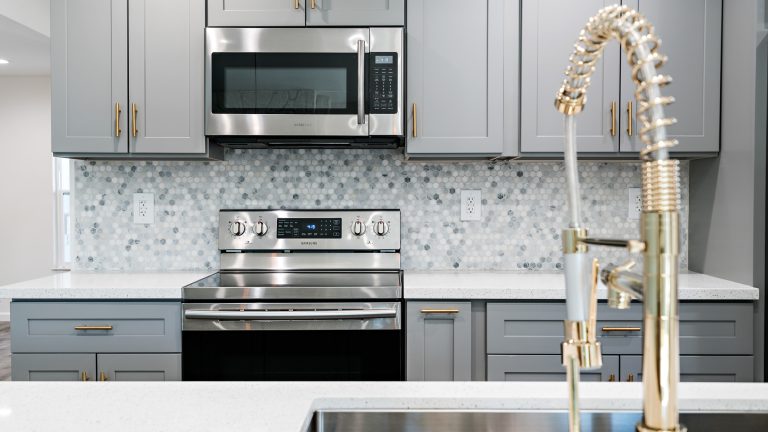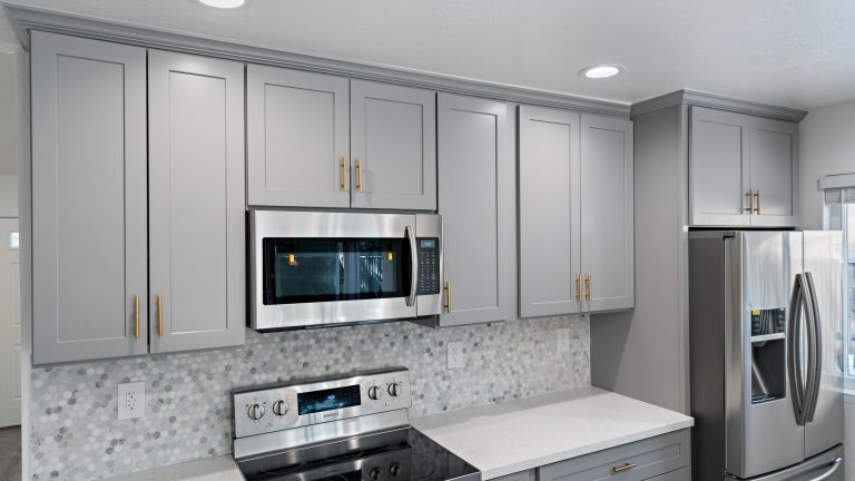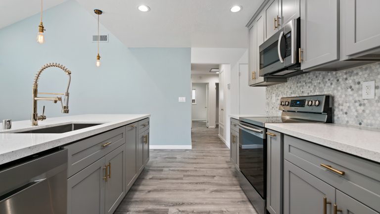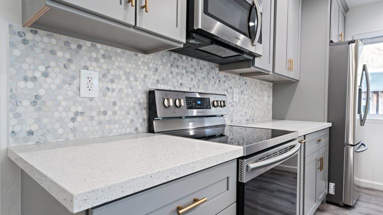 This kitchen was totally recreated. Repainting and laying new flooring created an inviting space. Modern energy efficient LED recessed lighting brings a warm ambience to the room. Upscale bluish gray cabinets with handsome gold handles add to the upgraded look and provide more than sufficient storage space. The multicolored bluish gray tile backsplash enhances the sleek feel and coordinates well with the cabinets. Beautiful quartz countertops are an attractive addition which afford ample workspace.