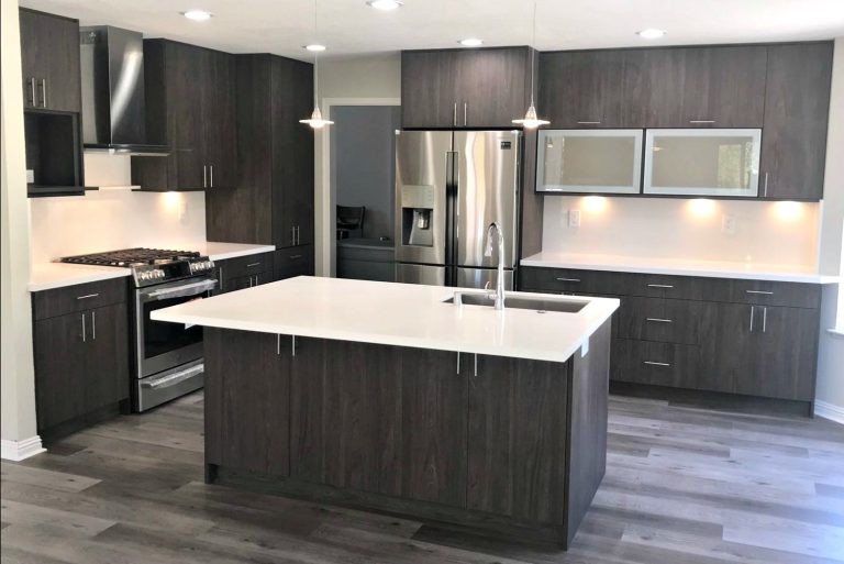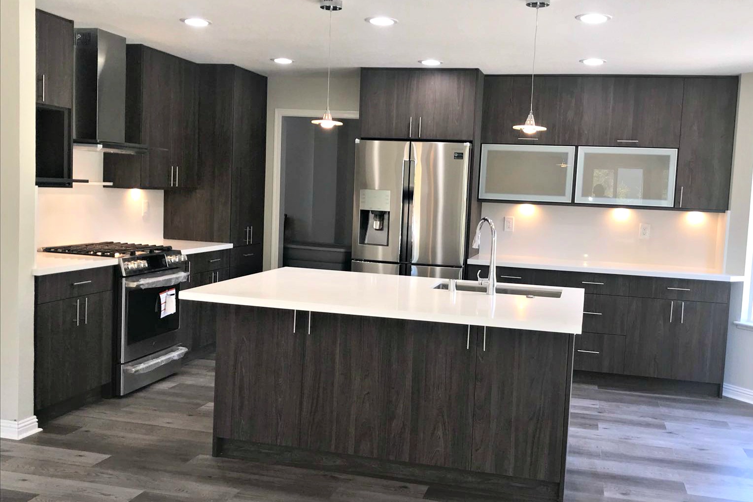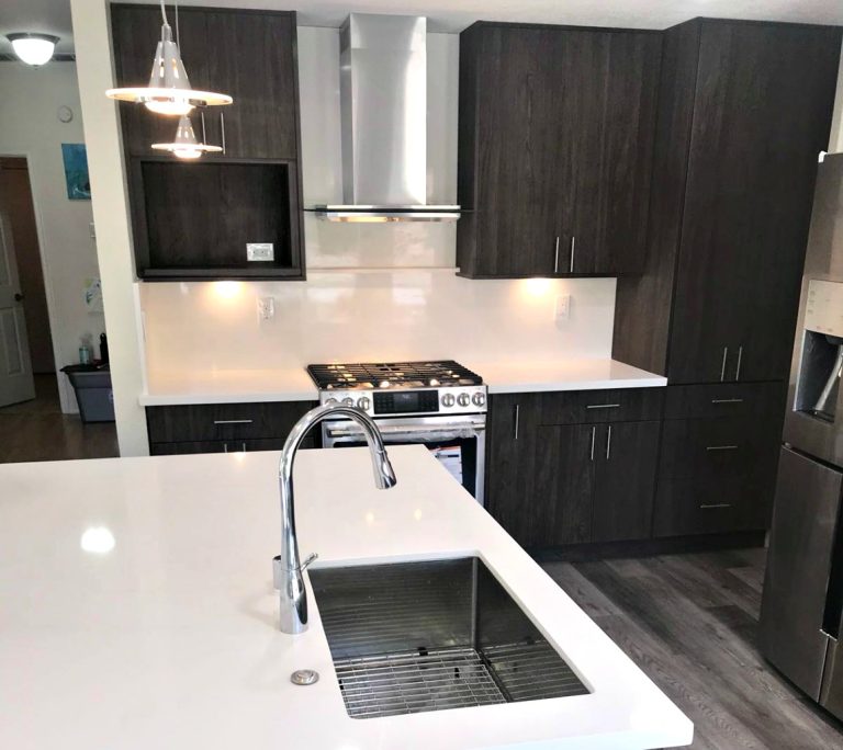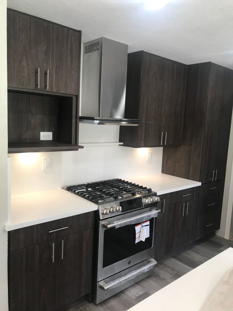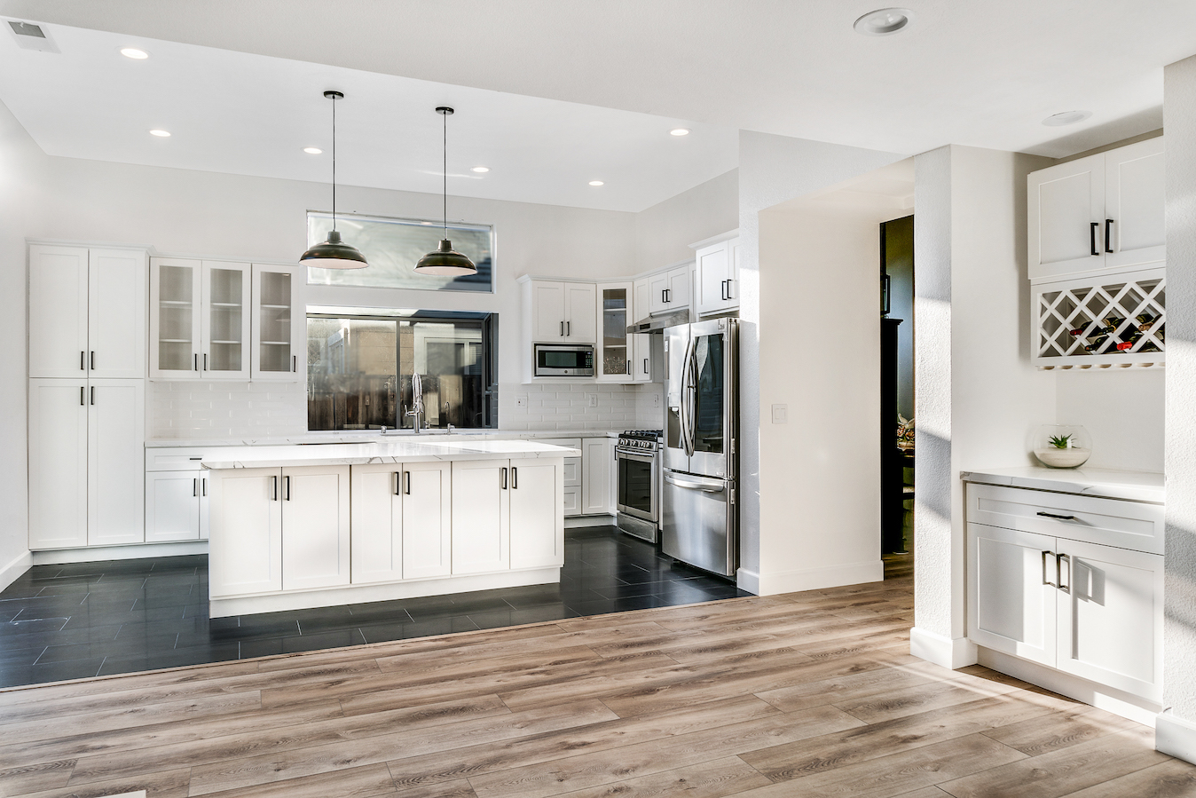 This kitchen was totally recreated. The room was repainted and new flooring was laid. A modern window and a beautiful under mount sink were installed. Upscale cabinets added to the upgraded look and provided more than sufficient storage space. We also retiled and added a sleek backsplash. The installation of new countertops provided both a clean look and ample work space in the kitchen. New lighting created a warm ambience and the perfect finishing touch.