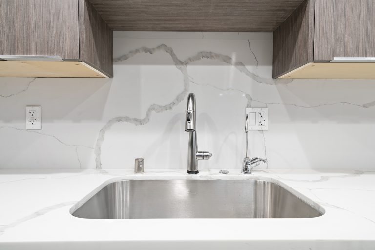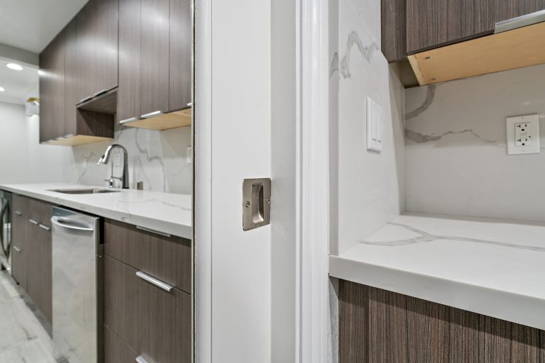 This small kitchen was completely transformed into a beautiful modern space! The size of this kitchen was smaller so we went with lighter coloring for the granite counter tops and flooring to open up the space. Additionally, the granite extends up into a beautiful backsplash that is a nice compliment to the cabinets and walls. The light color choices allows the smooth wood cabinets to stand out and give the kitchen more personality!